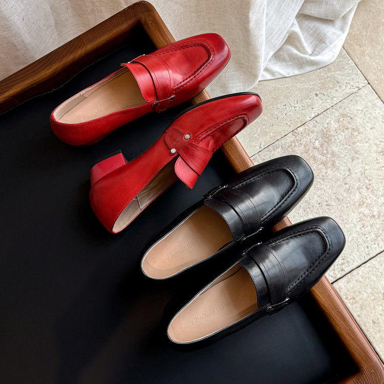 2026新款复古真皮粗跟乐福鞋女小个子久站不累脚深口单鞋百搭高跟鞋