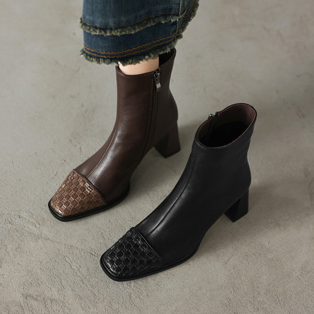 5cm大象纹头层牛皮法式小短靴女方头粗跟马丁靴猫跟中跟及裸靴瘦瘦靴